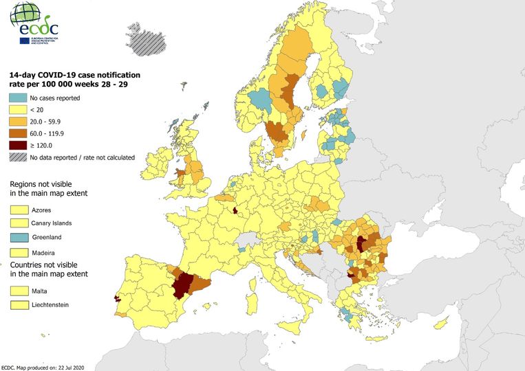 Europese Coronakaart / Nederland Kleurt Groener Op Europese Coronakaart - De europese coronakaart kleurt, afgezien van nederland, spanje, portugal en enkele kleinere regio's in andere landen, bijna volledig groen.. In het onderstaande overzicht ziet u per land precies welke coronamaatregelen er gelden en of u in een land als kampeerder en toerist welkom bent. Dat meldt minister hugo de jonge op twitter. De commissie doet er alles aan om mensen toch zoveel mogelijk in staat te stellen hun vrienden en familie te ontmoeten, op zakenreis te gaan en het vrije. Ook spanje kleurt een stuk roder, enkel het centrum krijgt nog een oranje kleur. Op deze website kun je de kaart zien en de indicatoren wat betreft de kleuren groen, oranje, rood en donkerrood of grijs.
